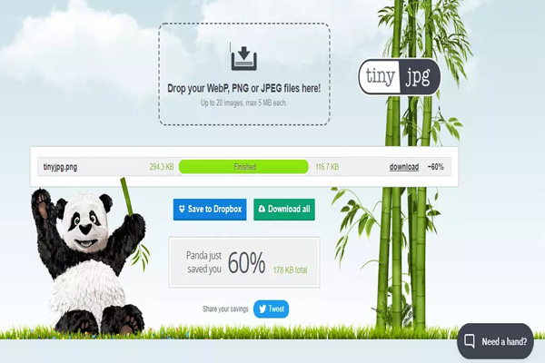TinyJPG ialah salah satu web untuk mengecilkan foto yang paling mudah dan efektif. Di app ini, kamu dapat memperkecil ukuran foto dengan file JPEG. Untuk mendapatkan kualitas yang baik, sistem TinyJPG memberikan hasil yang lumayan. Kamu juga bisa merubah ukuran sampai cropping foto dan gambar dengan TinyJPG.