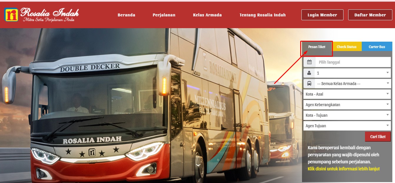 Berikut ialah cara memesan tiket bus Rosalia Indah melalui website: