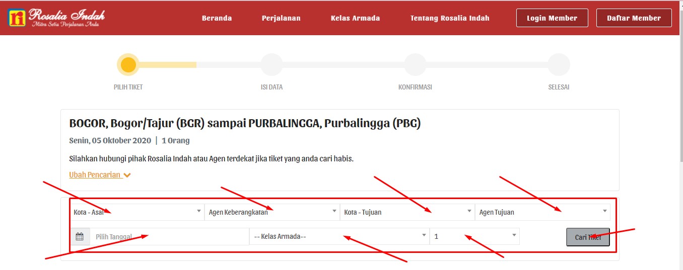 • Masukkan rincian tanggal keberangkatan kamu, jumlah tiket yang dipesan, kelas bus, kota asal keberangkatan, lokasi agen keberangkatan, kota tujuan dan agen kedatangan.