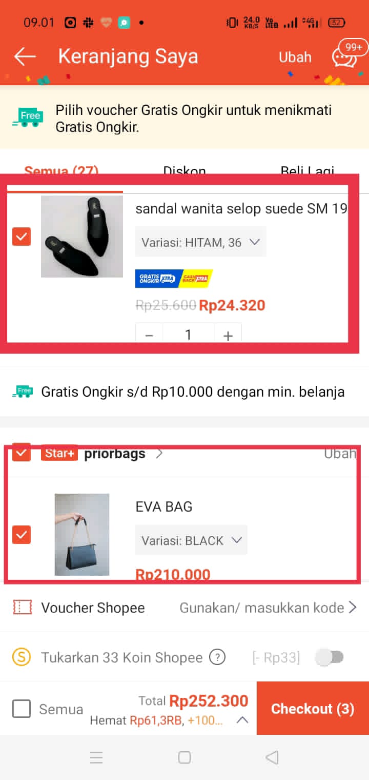 4. Anda akan melihat daftar barang-barang yang ada dalam keranjang belanja Anda. Pastikan jumlah dan varian barang sesuai dengan yang Anda inginkan.