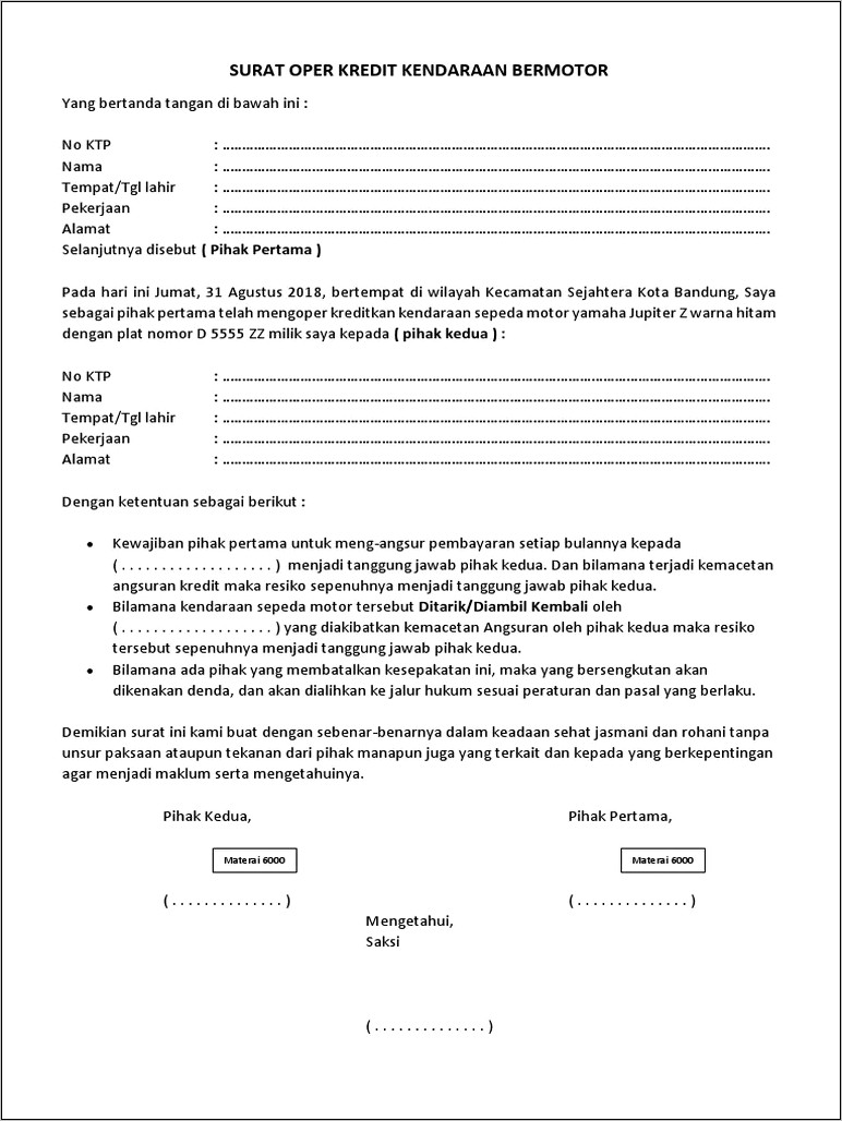 Setiap over kredit motor pasti akan melibatkan perjanjian antara penjual dan pembeli. Sebelum menandatangani perjanjian, bacalah dengan seksama dan pahami semua ketentuan yang tertera. Jika ada hal-hal yang tidak Anda mengerti, jangan ragu untuk bertanya kepada penjual agar semuanya jelas.