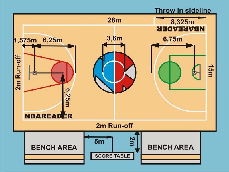 Dibawah ini ialah gambar dari lapangan basket. Didalam permainan bola basket, berdasarkan dari standar Federasi Bola Basket International, untuk ukuran lapangan bola basket ialah berbentuk persegi panjang dan punya dua standar ukuran. Yaitu mempunyai panjang 28,5 meter dan lebar 15 meter, akan tetapi untuk ukuran lapangan basket standar NBA punya panjang 26 meter dan lebar 14 meter .